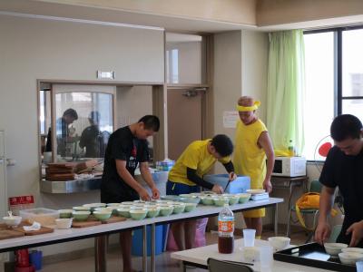 ●2日目30日朝昼食は、OGの北野、小谷、塵濱、出口、OBの清水さんらが朝から豚丼を作ってくれています。