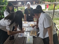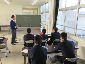 12月7日木曜日に、花と緑系列の2年生を対象に、“森の恵み教室”を行いました。当日は、連日の悪天候が嘘のような好天に恵まれ、石川県林業研究グループ連絡協議会の潟端良子さんを講師にお招きし、シイタケとナメコの原木栽培を行いました。昨年度は、猪(イノシシ)の燻製を行ったのですが、今年度は津幡町内で伐倒したコナラの原木に、シイタケとナメコの種菌を植菌しました。生徒は初めて行う作業でしたが、徐々に慣れてきて良い経験となりました。また、この日は英田小学校の6年生が見学に来ました。少しの間でしたが、協力して作業をすることができお互いに良い経験になったと思います。