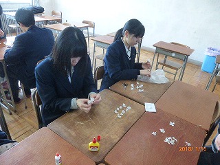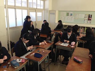 2月2日の総合学科2年生の「総合的な学習の時間」に、卒業生に送るためのシルクコサージュの制作に取り組みました。これまでは、花と緑系列の生徒だけが制作していたため、他の系列の生徒にとっては初めての体験となりました。作業は、生徒会やJRC部、園芸部などの生徒たちが今までに作ったコサージュの補修作業です。細かい作業なので、色々と大変だったと思いますが、みな真剣に取り組んでいました。