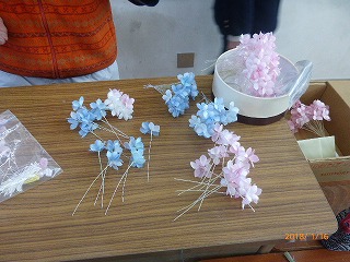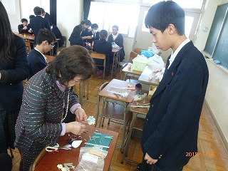 おかげ様で参加された皆さんには、喜んでいただきました。本日、花と緑系列の2年生を対象に、シルクコサージュ講習会の2回目を行いました。昨年12月に行ったコサージュ作成の続きを行い、完成を目指しました。当初は、講師の福西先生、本間先生も時間以内にできるか不安だったと話しておられたのですが、全員無事に完成することができました。(最後は実際に制服に付けてみました)