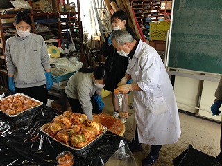 2月2日(金) キムチの袋詰めの作業がありました。このキムチは、花と緑系列の三年生が、1月19日の実習の時間に仕込んだもので、約2週間の漬け込み期間を経て取り出したものです。キムチの主役であるハクサイは本校の農場で採れたものを使用し、調味料は本格韓国料理店に注文したものを使うなど、本校自慢の自家製キムチです。