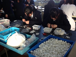 本日、花と緑系列の2年生を対象に、シルクコサージュ講習会を行いました。講師は花まゆ本部認定講師の福西泰子さんです。本校で秋に飼育していた繭と福西さんが持参して下さった繭を使って、コサージュのフラワーアレンジメントに挑戦しました。このコサージュは、今年度の卒業生にプレゼントする予定です。