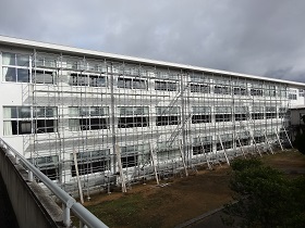 現在、本校の教室棟に足場が組まれ、教室のエアコン工事が進んでいます。