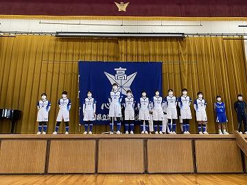 例年は、すべての部がステージ前に整列して、各部の代表がステージ上にて試合日程や意気込みを語っていました。今年度は、密を避けるために、2階のランニングロードに生徒(選手)が並び、ステージ上には1つの部だけが上がり紹介されるという形を取りました。それぞれの部が順番にステージには上がりましたが、「3年生のみ」や「10人以内」といった制限をかけざるを得ず、少し心苦しい面もありました。