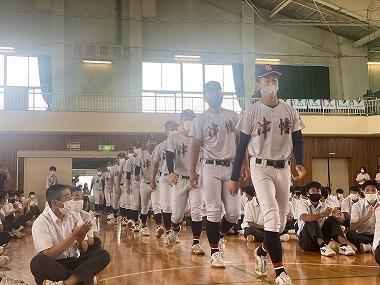 また、生徒代表として挨拶を行った幸地さんは「全校生徒を代表して微力ではありますが、皆さんが勝つことを願っています」という思いを述べたり、山本校長先生からは、本校OBである金丸選手の現役時代の行動や仕草を例に挙げられて、試合以外での己の行動(挨拶や振る舞いといった礼儀等)についてスポーツを行う人としての『心』の在り方を熱く語っていただきました。