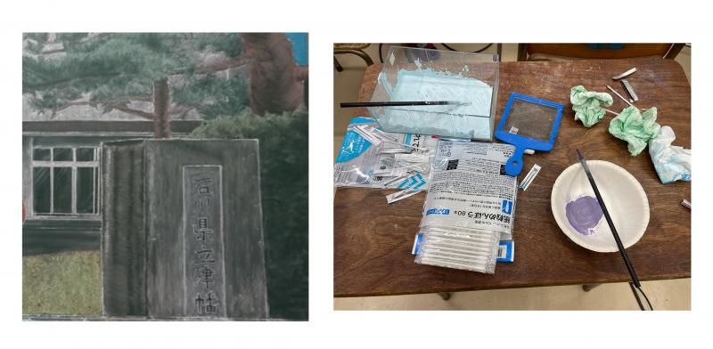 3年生の酒井くんは、校舎や空、門など背景を一人で描きました
