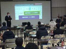 石倉校長の挨拶の後、西川教頭がスポーツ健康科学科と総合学科の両学科について、紹介させていただきました。