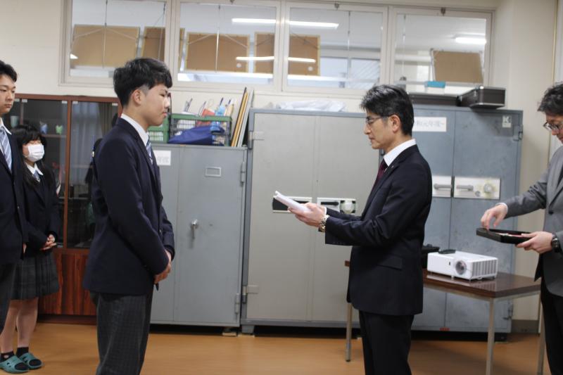 贈呈式では、財団常務理事の藤井様から、目録が生徒代表の石黒さん(生徒会副会長)に手渡されました。