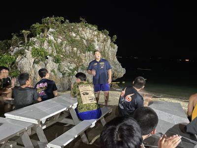 金城先生が三線を演奏し、柔道部の2人が一曲ずつ歌い、スポ科全員で祝福しました。
