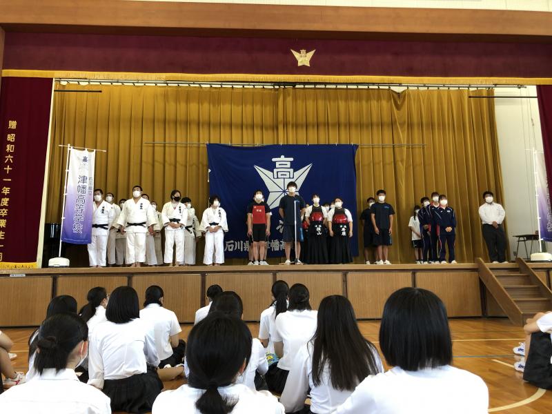 各部のユニフォームをきた選手のみなさんは、普段学校で見る顔とはまた違った、キリッと引き締まった表情でとてもかっこいい姿を見せてくれました。今までのすべてをぶつけて全国の舞台で「津幡旋風」を巻き起こしてきてください!!!