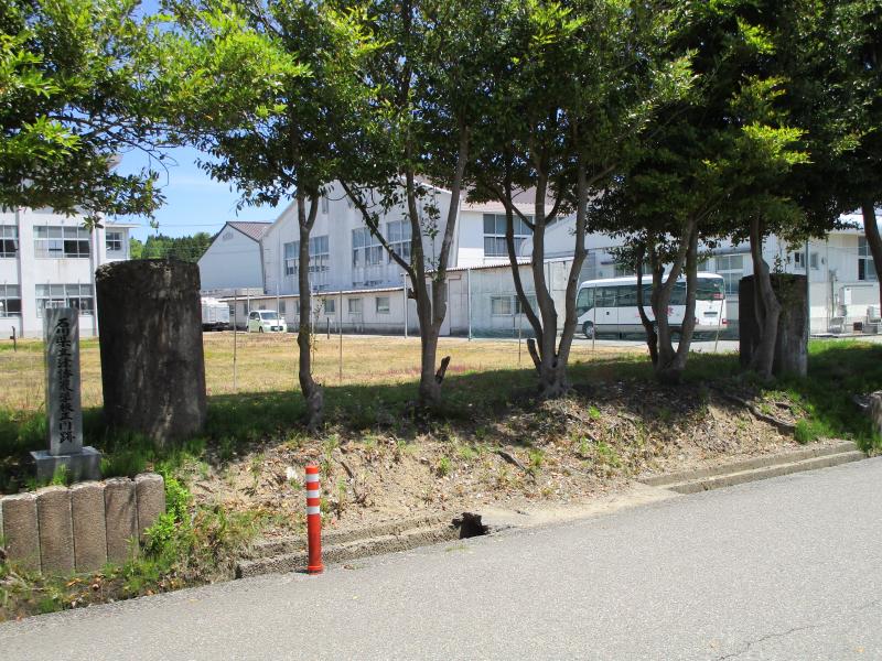 かっての津幡農蚕学校が建てられた場所、手前にある2本の古い石の門柱が「石川県立津幡農学校」の正門跡である。(平成6年6月記念碑建立)