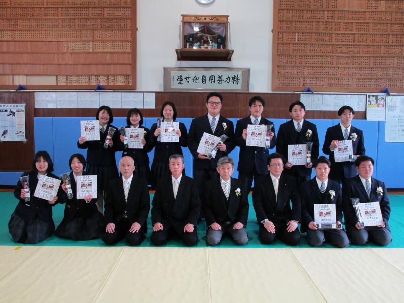 3月2日(木)卒業式後、柔道場で「卒業生を送る会」を行いました。最初に卒業生11名ひとり一人から、先生、後輩たちに言葉が贈られました。続いて2年生の堀男子主将、山﨑女子主将から感謝の言葉を、顧問の道上先生、中村先生、丸一先生、最後に山本総監督が餞の言葉を贈りました。その後、記念品を贈呈し、互いにこれまでの感謝の気持ちを伝え合いました。