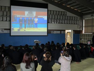 記念撮影後、3年間の部活動の様子、卒業生の小学校からの写真などの映像が流され、保護者の皆様も交え視聴しました。