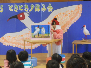 「とき保育園児の“トキメキ体験”」 7月30日に羽咋市にある「とき保育園」に行きました。 園児との交流で紙芝居を読み、トキメキカード作りをしました。 とき保育園にトッキーとメッキーが来て、私たちが作ったトキの紙芝居をトッキーが読んでくれました。 その後、トキメキカードを作りました。 園児のみんなはすごく楽しそうに作っていて、準備をした私たちもその笑顔を見ていたら、やってよかったと感じた1日でした。 トッキーによる紙芝居