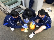 明日(10月30日)の文化祭を前にして、生徒玄関にはハロウィンカボチャが置かれました。本校の花と緑(園芸)系列の生徒がカボチャを育て、ハロウィン用に工作したものです。文化祭や学校公開等でお越しの際に是非ご覧ください。