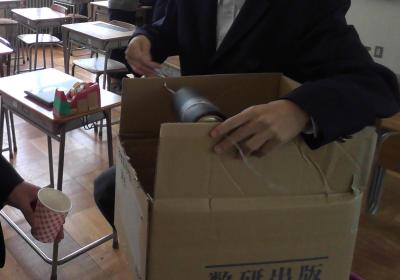 ↑繭を煮て手作りの装置で糸を巻き取る生徒