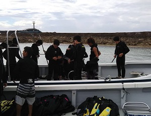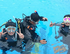 ↓宜野湾マリン支援センター | ↓講習と筆記試験の後のプールでの実技です。 |