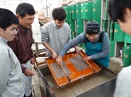 〇生徒たちは慣れない手つきながらも、「すげた」を操り、和紙を漉(す)いて卒業証書の台紙を製作していました。今から完成が楽しみです。斎藤様、奥様ありがとうございました。