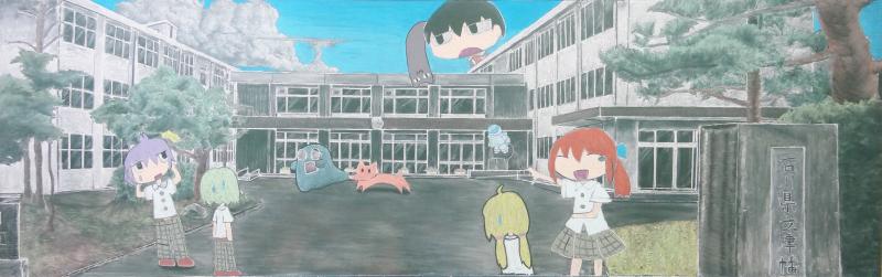 3年生の酒井くんは、校舎や空、門など背景を一人で描きました
