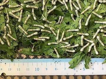 桑の葉を食べる勢いも増し、現在は一食につき10枚前後の新鮮な桑の葉(桑の葉の先端から3~4枚目の葉)を与えています。
