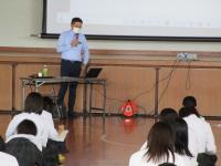 塩谷社長は、社会人として幸せな生活を送りたいと望むなら「努力し、責任を持って行動していく」ことが大事で、行動においては「目的・目標・手段」を明確にすることの大切さ、目標達成には「強い意志と情熱を持って取り組む」ことを温暖化問題への対策とあわせてお話していただきました。また生徒からの質問には「面接における第一印象の重要性」、「問題解決能力の必要性、相談することな大切さ」「人をまとめていくうえで大事なこと」などをお答えいただきました。