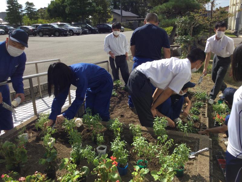 24名の生徒が3班に分かれ、3段の花壇に、思い思いにデザインし、植えていきました。