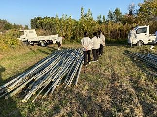 ダンプで運ばれた竹は、本校の農場の一角に下されました。