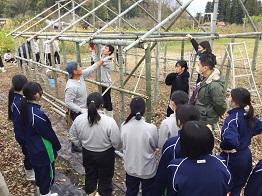 生徒は、脚立で上に上がりながら、針金で締め上げています。