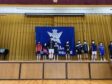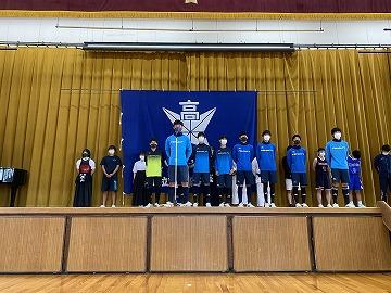 例年は、すべての部がステージ前に整列して、各部の代表がステージ上にて試合日程や意気込みを語っていました。今年度は、密を避けるために、2階のランニングロードに生徒(選手)が並び、ステージ上には1つの部だけが上がり紹介されるという形を取りました。それぞれの部が順番にステージには上がりましたが、「3年生のみ」や「10人以内」といった制限をかけざるを得ず、少し心苦しい面もありました。