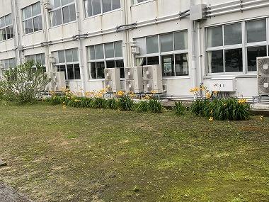 津幡高校の中庭には、5月中旬から下旬にかけて、オレンジ色の綺麗な花が咲き誇ります。これは、「トビシマカンゾウ(飛島萱草)」というユリ科の植物で、野生下で群生しているのはどうやら2ヶ所だけのようです(以下に公益社団法人 新潟県観光協会のリンクをはっておきます)。本校の「トビシマカンゾウ」は“朱鷺サポート隊”で毎年お世話になっていた佐渡島の「佐渡総合高校」より株分けしていただいたものです。2年前の『花と緑系列(現在は園芸系列に名称変更)』の3年生がプランターにて栽培していたものを中庭に定植しました。中庭に引っ越しをして今年で3回目の開花となり、津幡高校の新しい中庭の顔として、これからもよろしくお願いします。