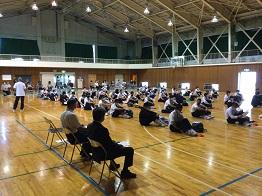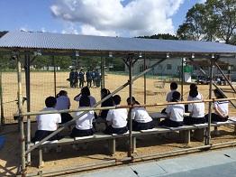 クラスでの朝礼の後、全校生徒がグラウンドに集合しました。