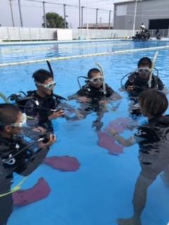 プールで明日の海洋実習に向けて、実際にタンクを担いで潜る練習をしました。