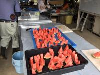 授業体験の後は、本校の農場を見学しました。ビニールハウスで栽培されている糖度の高いミニトマトを実際に食べてもらいました。参加者がトマトを口にするとおもわず「甘い」という声があがりました。秋に収穫予定のブドウをハウスで見学した後、農場で収穫されたスイカをほお張り、暑さで渇いた喉をうるおしました。