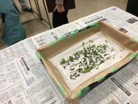 ●摘み取ってきた桑の葉の水分を丁寧に拭き取り、幼虫が食べやすいように包丁で刻んで小さくしたものを与えます。
