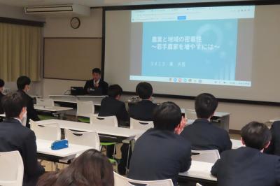 12月からグループ発表を行い、評価の高かった生徒8名が代表に選ばれ、総合学科1~3年生全体の前で発表しま