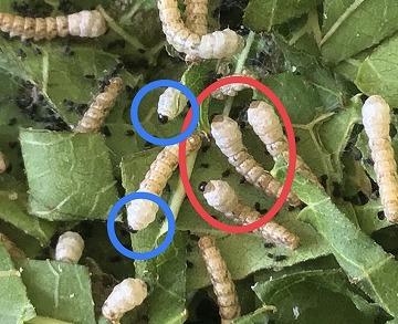 ※まだ眠に入っていない1令の蚕(画像の青丸で囲った蚕)