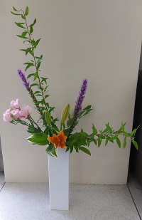 華道部では玄関と来賓控室に飾る作品を生けました。生徒は試行錯誤しながら生け、その結果とても華やかな作品ができあがりました。ご覧ください。