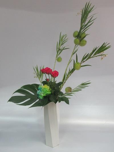 5名の華道部員はとても熱心にお稽古を続けています。生け方にも個性があり、「思い切りよく、グイグイ生けていくタイプ」「じっくりと、ベストな配置を考えるタイプ」など、生け方にも個性がはっきりとあらわれ、とても興味深いです。どの生徒も、お花の生命力や可憐さに触れるのが、とても楽しいようで、「華道部の活動はどうですか?」と尋ねると、「すっごく!楽しいです!!」という答えが返ってきます。それではまだ紹介していなかった作品をごらんください。