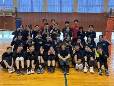 部員同士は、家族のように仲が良く、楽しく笑いが絶えない雰囲気の中で互いに声を掛け合い励まし合っているため、先輩後輩の関係も自然と深まります。また、練習中や外部での活動などでは、礼儀や挨拶、感謝を大切にして取り組んでいます。他校との合同練習や練習試合、日曜日にたまに行う練習会、春の遠足など、さまざまな活動を通して、私たちは絆を深めてきました。大会では、練習会や練習試合で交流のあったバレーボール部から応援してもらうこともあり、部員の励みになっていました。
