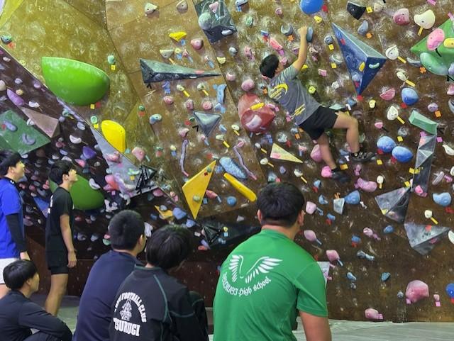 はじめてボルダリングに取り組む選手が殆どでしたが、チームで協力して課題のクリアに向けて取り組んでいました。体重のかけ方や足の位置など、皆で試行錯誤しながら声を掛け合って頑張っていました。