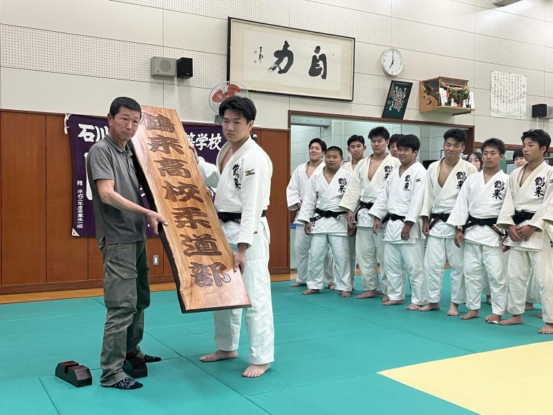 令和7年5月29日(木)に保護者から柔道部へ部名入りの木彫看板をいただきまいた。とても立派で重く、今後、更なる歴史をつくっていってくれると思います。保護者の皆さまありがとうございました。