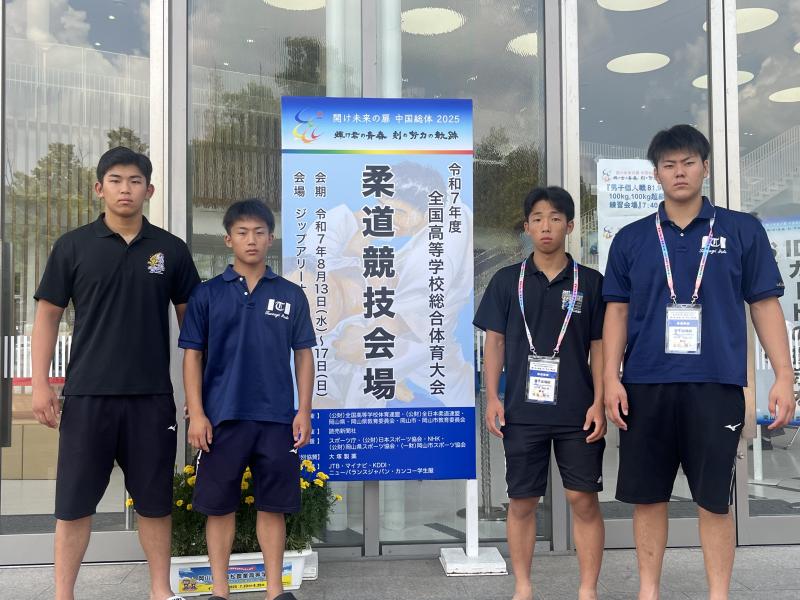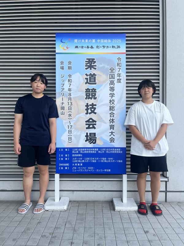 令和7年8月13日から17日まで岡山県でインターハイが行われました。本校からは、男子個人60kg級に井海地力、100kg級に石川銀十、女子個人78kg超級に山浦依未が出場しました。結果は残念ながら初戦敗退と全国の強豪にはかないませんでしたが、全国で上位に行くためには、今以上の努力が必要であることを後輩に見せてくれました。