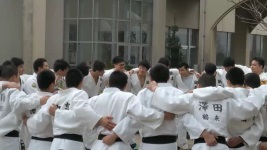 3年生を送る会では、2年生一人ひとりが感謝の言葉を述べていました。途中で涙ぐみ、3年生を送りだすさみしさを噛みしめながら話す者もいました。3年生は、3年間の想いを指導者、後輩たち、そして親に話してくれました。元主将の庄源くんが「失敗だらけの高校生活だった。でも、この失敗を成功につなげたい。」と強い気持ちを述べてくれました。その後に、学び舎に挨拶、柔道部全員で栄光の架橋を熱唱。涙が止まりませんでした。