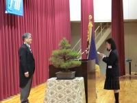 その後に行われた同窓会入会式では同窓会会長の酒井一朗様から歓迎の言葉と入会の許可をいただき、総代の兼政倫也さんが誓いの言葉を述べました。