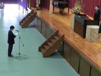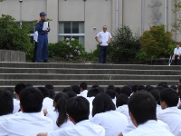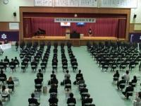 挨拶が少しずつ良くなっている生徒が増えているので、さらに質を高めていってほしいといった話など、在校生に向けての激励の言葉が送られました。その後、全校生徒でマスク越しに校歌と応援歌を歌いあげました。