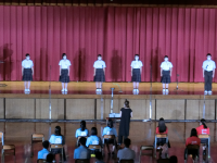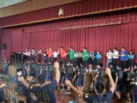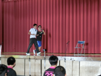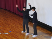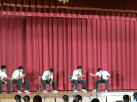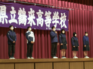 その後、校歌、応援歌の斉唱とつづき、最後に生徒指導から「挨拶」についての先生方の実演をまじえ、なごやかな雰囲気で鶴高あいさつについて理解を深めることができました。
