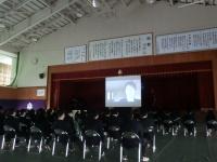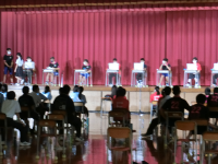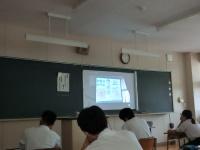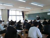 3学年が一斉に体育館に集まると密になるため、2クラスのみ直接講話を聴き、残りのクラスは各教室でZoom配信による視聴となりました。