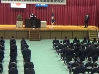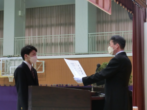 表彰伝達式、目録贈呈式に続いて同窓会入会式が行われました。例年、式前に伝統歌披露ということで、全校生徒で学生歌、応援歌を披露していますが、今年は感染症対策のため2,3年で学生歌、1,3年で舟岡古調(例年卒業式当日披露しているものの今年は校歌のみとなったため)を披露しました。