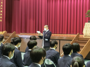 2学期終業式では学校長からコロナ禍で先の見えない状況であっても、目標に向かって自分を磨いていく力をつけ、年末年始を機会に取り組むべきことを明確にして、仲間といる時間、一人でいる時間、それぞれ有意義に過ごしてほしいというお話がありました。