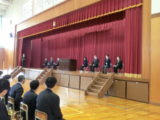 終業式の後、卒業した3年生も体育館の後ろのほうに控える中、離任式が行われました。